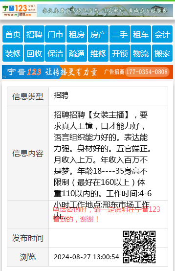 招聘招聘【女装主播】,要求真人上镜,口才能力好,语言组织能力好的。表达能力强。身材好的。五官端正。月收入上万。年收入百万不是梦。年龄18----35身高不限制(最好在160以上)体重110以内的。工作时间:4-6小时工作地点:邢东市场工作内容:女装上镜直播联系方式:17325600002/18833466266 聘 |