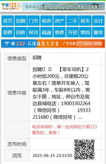 招聘 【带车司机】2小时给200元,总里程20公里左右!简单开车接人,驾龄满3年,车龄8年以内,男女不限,地址,邢台市及周边县城电话:19003302264(微信同号) 19333211680(微信同号) 聘