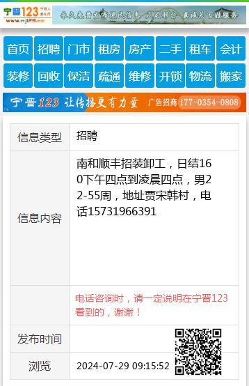 南和顺丰招装卸工,日结160下午四点到凌晨四点,男22-55周,地址贾宋韩村,电话15731966391