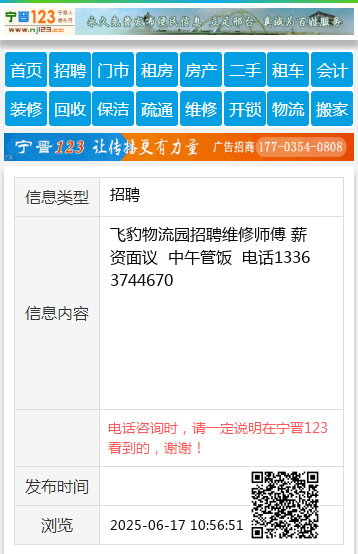 飞豹物流园招聘维修师傅 薪资面议 中午管饭 电话13363744670