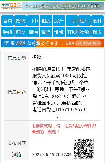 招聘招聘暑假工 库房配和客服货人员底薪1000 可以推销完了开单配货提成一个点 18岁以上 每晚上下午7点--晚上1点 办公:滨江路旁边 碧桂园附近 只要桥西的。 电话同微信☎15713295731 聘