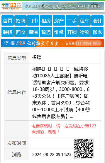 招聘 诚聘移动10086人工客服】接听电话帮助客户解决问题。要求:18-38周岁,3000-8000,6-8天公休!【客户顾问】周末双休,首月3900,综合4000~10000上不封顶【400热线售后客服专员】接听客户来电处理保险售后问题,月休8~10天,18-40周岁,3千~4千,女士提供住宿 带薪培训!电话:15030486772(信)地址:襄都爱特园 聘 |