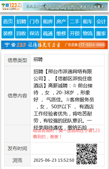 招聘【邢台市派逸网络有限公司】、【信都区派悦住宿酒店】高薪诚聘:☆ 前台接待 ,女 ,20-38岁 ,形象好 , 气质佳。☆客房服务员 ,女, 50岁以下 , 有酒店工作经验者优先,肯吃苦耐劳,有较强的团队意识。一经录用待遇优,缴纳五险 薪资高 待遇好电话:18333955566 杨经理地址:守敬南路与后炉子大街交口西行派e-sports电竞酒店 聘 |