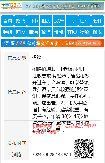 招聘招聘1、【老板司机】任职要求:有经验,曾给老板开过车,会喝酒、可以替领导挡酒,具有较强的服务意识,保密意识强、责任心强、能适应出差。2、【人事经理】有经验、踏实稳重、有责任心。年龄:30岁-45岁地点:邢台市信都区碧桂园小区薪资面议。电话:15227664567 聘