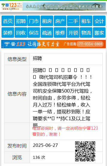招聘 微代驾司机招募令 !!!全国连锁微代驾平台为代驾司机安全保障500万代驾险,时间自由,多劳多得,轻松月入过万!轻松接单,收入一单一结,提现秒到账!应聘要求**✔ **持C1及以上驾照,驾龄≥3年**✔ **无酒驾等严重交通违法记录**✔ **年龄21~54周岁,身体健康**✔ **自备智能手机,能熟练使用导航**咨询电话:18203295795(同微信号)快来加入我们微代驾大家庭吧! 聘 |