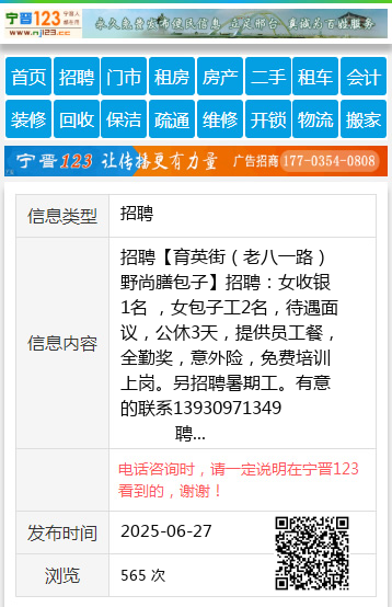招聘【育英街(老八一路)野尚膳包子】招聘:女收银1名 ,女包子工2名,待遇面议,公休3天,提供员工餐,全勤奖,意外险,免费培训上岗。另招聘暑期工。有意的联系13930971349 聘
