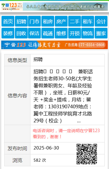招聘 兼职话务招生老师30-50名(大学生暑假兼职男女、年龄及经验不限),坐班,日薪80元/天 +奖金+提成,月结;翟老师:13031907409地点:冀中工程技师学院育才北路29号(校企) 聘