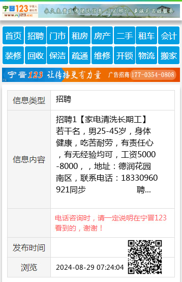 招聘1【家电清洗长期工】若干名,男25-45岁,身体健康,吃苦耐劳,有责任心,有无经验均可,工资5000-8000,,地址:德润花园南区,联系电话:18330960921同步 聘