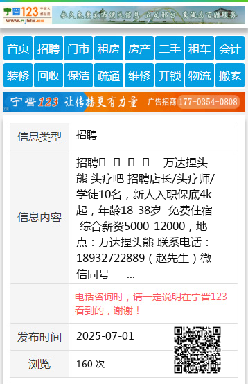招聘 万达捏头熊 头疗吧 招聘店长/头疗师/学徒10名,新人入职保底4k起,年龄18-38岁 免费住宿 综合薪资5000-12000,地点:万达捏头熊 联系电话:18932722889(赵先生)微信同号 聘