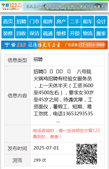 招聘 八号院火锅鸡招聘有经验女服务员,上一天休半天(工资3600至4500左右),要求女30岁至45岁之间,待遇优厚,工资面仪,暑假工、短期、难工勿扰,电话13653293535 聘
