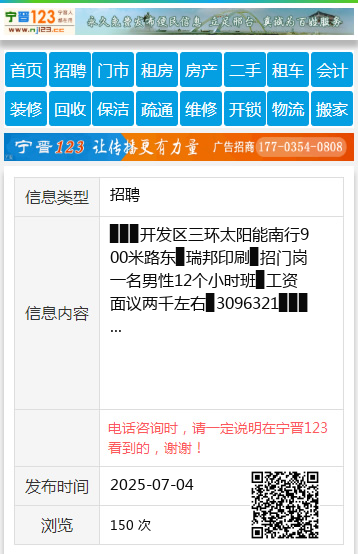 ▉▉▉开发区三环太阳能南行900米路东▉瑞邦印刷▉招门岗一名男性12个小时班▉工资面议两千左右▉3096321▉▉▉