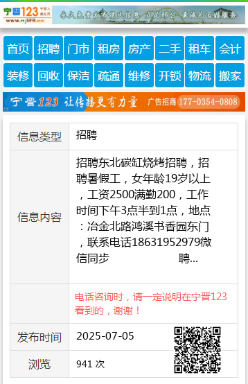招聘东北碳缸烧烤招聘,招聘暑假工,女年龄19岁以上,工资2500满勤200,工作时间下午3点半到1点,地点:冶金北路鸿溪书香园东门,联系电话18631952979微信同步 聘