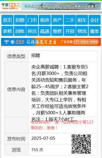 央企高薪诚聘:1.客服专员5名:月薪3000+,负责公司相关活动告知和售后服务,年龄25--45周岁;2.客服主管2名:负责团队相关事务管理培训,大专以上学历,有相关工作经验可适当放宽条件,月薪5000+3.人事助理两名注:1.每天7小时工作制,周末双休 2.养老医疗保障 3.系统培训机制,晋升空间大;国企招聘一辈子有保障李经理:15830726364 |