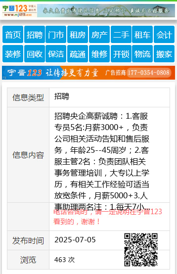招聘央企高薪诚聘:1.客服专员5名:月薪3000+,负责公司相关活动告知和售后服务,年龄25--45周岁;2.客服主管2名:负责团队相关事务管理培训,大专以上学历,有相关工作经验可适当放宽条件,月薪5000+3.人事助理两名注:1.每天7小时工作制,周末双休 2.养老医疗保障 3.系统培训机制,晋升空间大;国企招聘一辈子有保障李经理:15830726364 聘 |