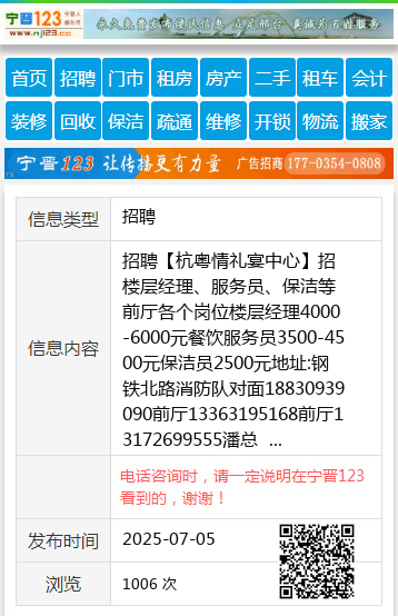 招聘【杭粤情礼宴中心】招楼层经理、服务员、保洁等前厅各个岗位楼层经理4000-6000元餐饮服务员3500-4500元保洁员2500元地址:钢铁北路消防队对面18830939090前厅13363195168前厅13172699555潘总 聘