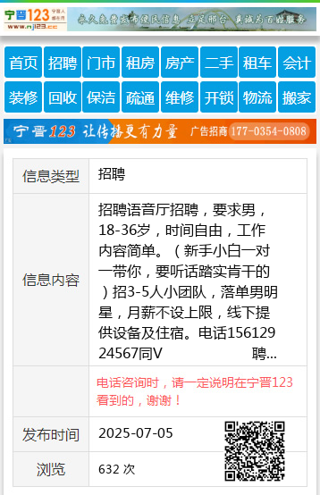 招聘语音厅招聘,要求男,18-36岁,时间自由,工作内容简单。(新手小白一对一带你,要听话踏实肯干的)招3-5人小团队,落单男明星,月薪不设上限,线下提供设备及住宿。电话15612924567同V 聘