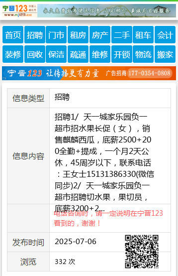 招聘1/ 天一城家乐园负一超市招水果长促(女),销售麒麟西瓜,底薪2500+200全勤+提成,一个月2天公休,45周岁以下,联系电话:王女士15131386330(微信同步)2/ 天一城家乐园负一超市招聘切水果,果切员,底薪3200+200全勤+提成,服从安排,干活利索,吃苦耐劳,联系人:王女士,15131386330(微信同号) 聘 |