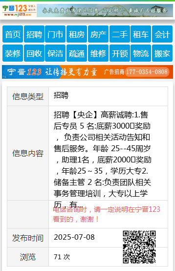 招聘【央企】高薪诚聘:1.售后专员 5 名:底薪3000➕奖励, 负责公司相关活动告知和售后服务。年龄 25--45周岁,助理1名,底薪2000➕奖励,年龄25~35,学历大专2.储备主管 2 名:负责团队相关事务管理培训,大专以上学历,有相关工作经验可适当放宽条件,月薪6000➕注:1.每天 7 小时工作制,周末单休2.养老医疗保障电话:15333398066胡经理 聘 |