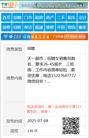 天一超市,招聘女销售员数名,要求26-45周岁,三班倒,工作内容简单轻松,薪资优厚,电话15227647772微信同号!