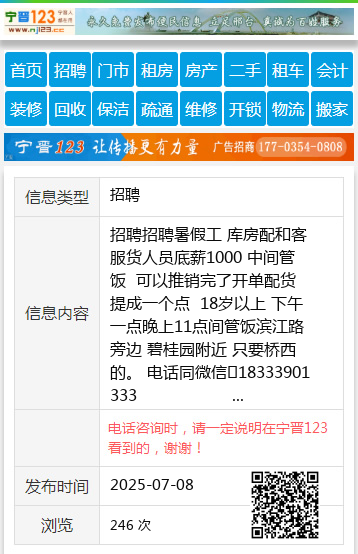 招聘招聘暑假工 库房配和客服货人员底薪1000 中间管饭 可以推销完了开单配货提成一个点 18岁以上 下午一点晚上11点间管饭滨江路旁边 碧桂园附近 只要桥西的。 电话同微信☎18333901333 聘