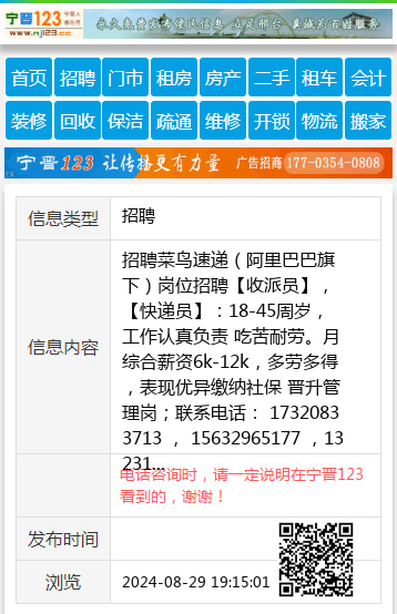 招聘菜鸟速递(阿里巴巴旗下)岗位招聘【收派员】,【快递员】:18-45周岁,工作认真负责 吃苦耐劳。月综合薪资6k-12k,多劳多得,表现优异缴纳社保 晋升管理岗;联系电话: 17320833713 , 15632965177 ,13231966333 聘