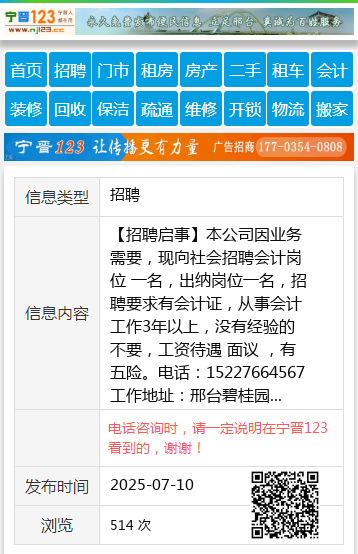 【招聘启事】本公司因业务需要,现向社会招聘会计岗位 一名,出纳岗位一名,招聘要求有会计证,从事会计工作3年以上,没有经验的不要,工资待遇 面议 ,有五险。电话:15227664567 工作地址:邢台碧桂园