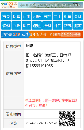 招一名跟车装卸工,日结170元,地址飞豹物流园,电话15533191055