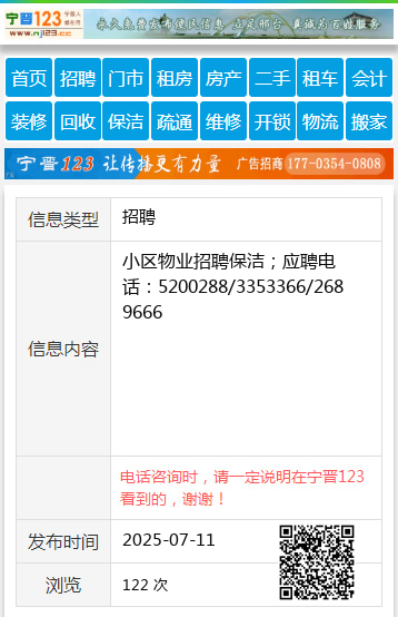 小区物业招聘保洁;应聘电话:5200288/3353366/2689666