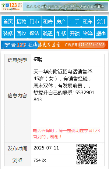 天一华府附近招电话销售25-45岁(女),有销售经验,周末双休,有发展前景,,想提升自己的联系15532901843