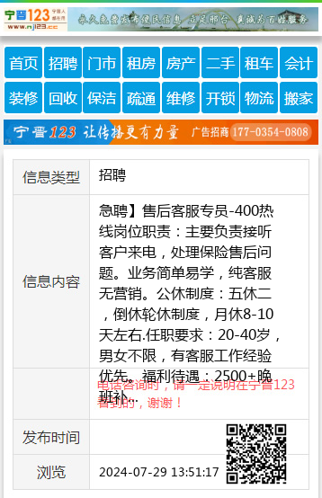 急聘】售后客服专员-400热线岗位职责:主要负责接听客户来电,处理保险售后问题。业务简单易学,纯客服无营销。公休制度:五休二,倒休轮休制度,月休8-10天左右.任职要求:20-40岁,男女不限,有客服工作经验优先。福利待遇:2500+晚班补贴+绩效 综合薪资3000~4000 电话:15030486772地址:邢台襄都区爱特园 |