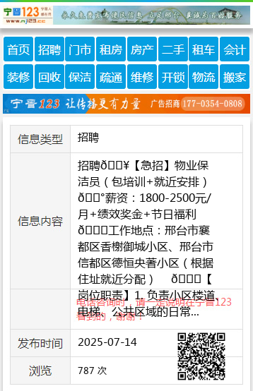 招聘🔥【急招】物业保洁员(包培训+就近安排)💰薪资:1800-2500元/月+绩效奖金+节日福利📍工作地点:邢台市襄都区香榭御城小区、邢台市信都区德恒央著小区(根据住址就近分配) 🌟【岗位职责】1. 负责小区楼道、电梯、公共区域的日常清洁与消毒;2. 维护垃圾投放点卫生,做好垃圾分类监督;3. 定期清理绿化带杂物,保持环境整洁;4. 配合物业完成临时清洁任务。 ✨【任职要求】✔️ 年龄18-65岁,身体健康,能吃苦耐劳;✔️ 无需经验!免费提供岗前培训;✔️ 有物业/酒店保洁经验者优先;✔️ 工作细致,责任心强。 🎁【福利待遇】✅ 月休4天,排班灵活(可协商早晚班);✅ 提供工作服+清洁工具;✅ 夏季高温补贴+年终红包;✅ 表现优异者可转长期工。 📞 快速应聘方式电话联系:13333196767微信咨询:扫码添加【微信号:13333196767】回复“保洁应聘” 聘 |
