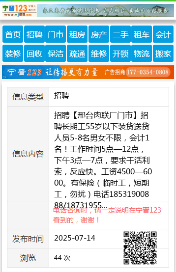 招聘【邢台肉联厂门市】招聘长期工55岁以下装货送货人员5-8名男女不限,会计1名!工作时间5点—12点,下午3点—7点,要求干活利索,反应快。工资4500—6000。有保险(临时工,短期工,勿扰)电话18531900888/18731955855 聘