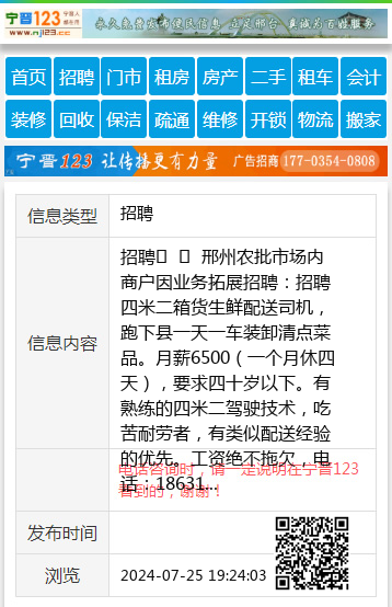 招聘 邢州农批市场内商户因业务拓展招聘:招聘四米二箱货生鲜配送司机,跑下县一天一车装卸清点菜品。月薪6500(一个月休四天),要求四十岁以下。有熟练的四米二驾驶技术,吃苦耐劳者,有类似配送经验的优先。工资绝不拖欠,电话:18631971537。(招长期工) 聘
