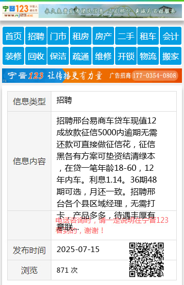 招聘邢台易商车贷车现值12成放款征信5000内逾期无需还款可直接做征信花,征信黑各有方案可垫资结清绿本,在贷一笔年龄18-60,12年内车。利息1.14。36期48期可选,月还一致。招聘邢台各个县区域经理,无需打卡,产品多多,待遇丰厚有意联系☎17733980105(微信同号) 聘