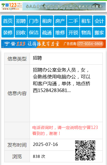 招聘办公室业务人员,女,会熟练使用电脑办公,可以和客户沟通,单休,地点桥西15284283681