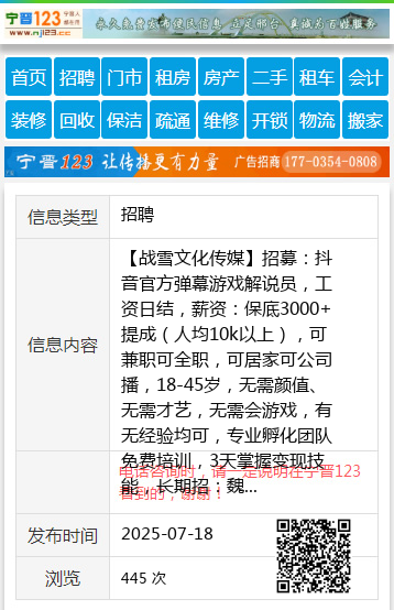 【战雪文化传媒】招募:抖音官方弹幕游戏解说员,工资日结,薪资:保底3000+提成(人均10k以上),可兼职可全职,可居家可公司播,18-45岁,无需颜值、无需才艺,无需会游戏,有无经验均可,专业孵化团队免费培训,3天掌握变现技能,长期招:魏经理15200168698(微信同)金经理15103290333(微信同)地址:襄都区万达广场锦华国际中心 |