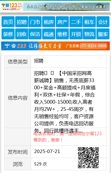 招聘 【中国采招网高薪诚聘】销售,无责底薪3300+奖金+高额提成+月度福利+双休+社保+年假,综合收入5000-15000,收入高者月均2W+,25-45周岁,有无销售经验均可,客户资源公司提供,负责电话回访服务。同行跳槽待遇丰厚,工作地点信都区居然之家,电话18330905950/15833613334 聘