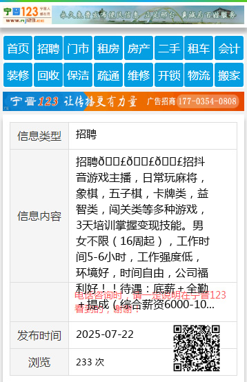 招聘📣📣📣招抖音游戏主播,日常玩麻将,象棋,五子棋,卡牌类,益智类,闯关类等多种游戏,3天培训掌握变现技能。男女不限(16周起),工作时间5-6小时,工作强度低,环境好,时间自由,公司福利好!!待遇:底薪+全勤+提成(综合薪资6000-10000上不封顶)专业团队提供培训、设备和场地支持,包教包会,招聘人数50人。地址:开发区创智园6楼嘉信文化。☎:15532987563 聘 |
