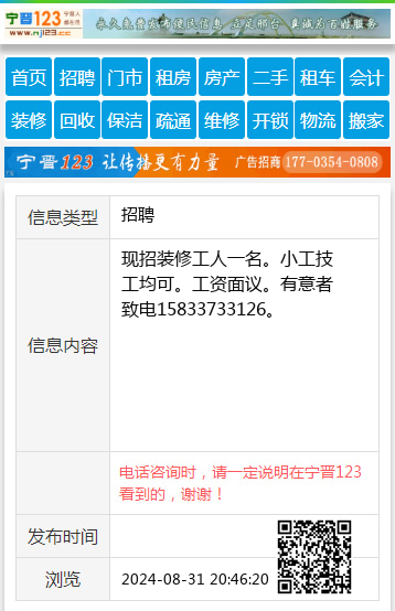 现招装修工人一名。小工技工均可。工资面议。有意者致电15833733126。