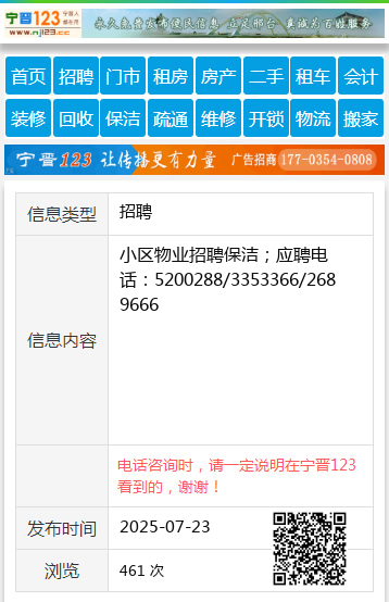 小区物业招聘保洁;应聘电话:5200288/3353366/2689666