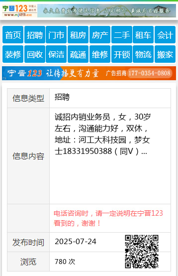 诚招内销业务员,女,30岁左右,沟通能力好,双休,地址:河工大科技园,梦女士18331950388(同V)