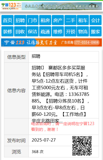 招聘 襄都区多多买菜服务站【招聘带车司机5名】,早5点-12点左右送货,计件工资5000元左右,无车可租赁新能源。电话:13363785885。【招聘分拣员10名】,早3点左右-早8点左右,日薪60-120元。【工作地点】辛庄北路田家庄附近。电话:15632931234。 聘