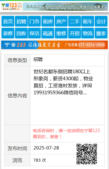 世纪名都东侧招聘180以上形象岗,薪资4300起,物业直招,工资准时发放,详询19931959366微信同号