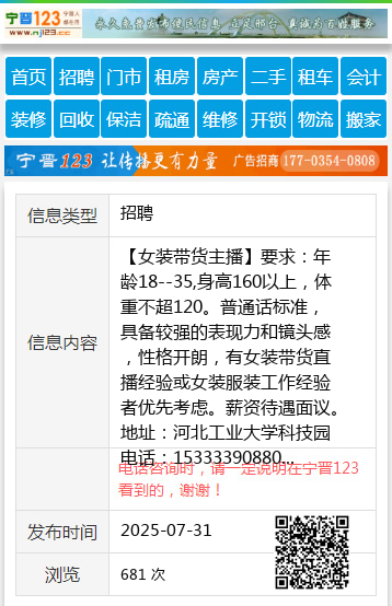 【女装带货主播】要求:年龄18--35,身高160以上,体重不超120。普通话标准,具备较强的表现力和镜头感,性格开朗,有女装带货直播经验或女装服装工作经验者优先考虑。薪资待遇面议。地址:河北工业大学科技园电话:15333390880