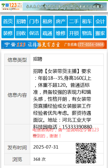 招聘【女装带货主播】要求:年龄18--35,身高160以上,体重不超120。普通话标准,具备较强的表现力和镜头感,性格开朗,有女装带货直播经验或女装服装工作经验者优先考虑。薪资待遇面议。地址:河北工业大学科技园电话:15333390880 聘