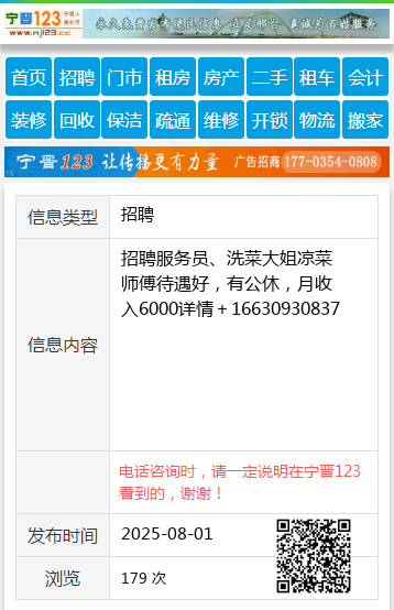 招聘服务员、洗菜大姐凉菜师傅待遇好,有公休,月收入6000详情+16630930837