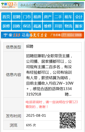 招聘招兼职/全职带货主播,公司播、居家播都可以,公司现有主播二百多名,有没有经验都可以,公司有培训有人带,薪资结算为周结,目前主播收入均在2W~10W+,感觉合适的话微信13343192918 聘