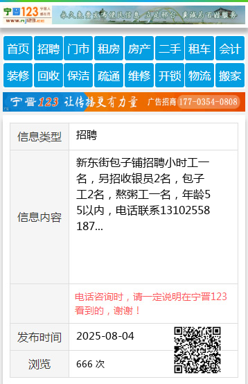 新东街包子铺招聘小时工一名,另招收银员2名,包子工2名,熬粥工一名,年龄55以内,电话联系13102558187