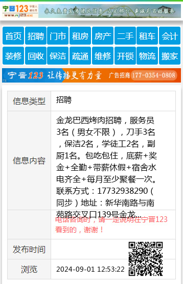 金龙巴西烤肉招聘,服务员3名(男女不限),刀手3名,保洁2名,学徒工2名,副厨1名。 包吃包住,底薪+奖金+全勤+带薪休假+宿舍水电齐全+每月至少聚餐一次。 联系方式:17732938290(同步) 地址:新华南路与南苑路交叉口139号金龙巴西烤肉