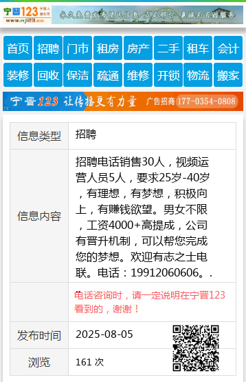 招聘电话销售30人,视频运营人员5人,要求25岁-40岁,有理想,有梦想,积极向上,有赚钱欲望。男女不限,工资4000+高提成,公司有晋升机制,可以帮您完成您的梦想。欢迎有志之士电联。电话:19912060606。